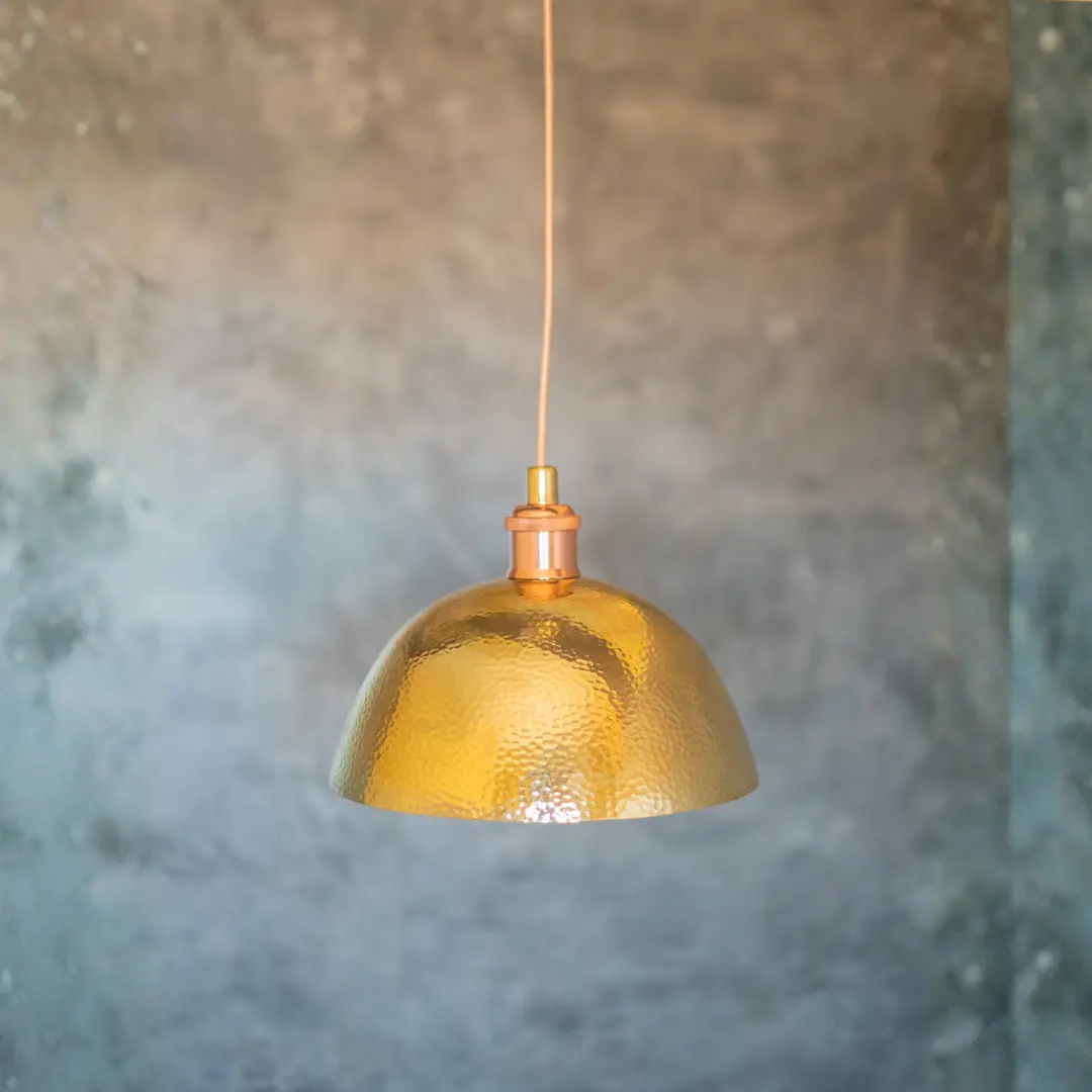 Elevate your space with the timeless elegance of handcrafted brass. Each pendant is meticulously hammered to create a stunning textured dome that casts warm, inviting light throughout your home.