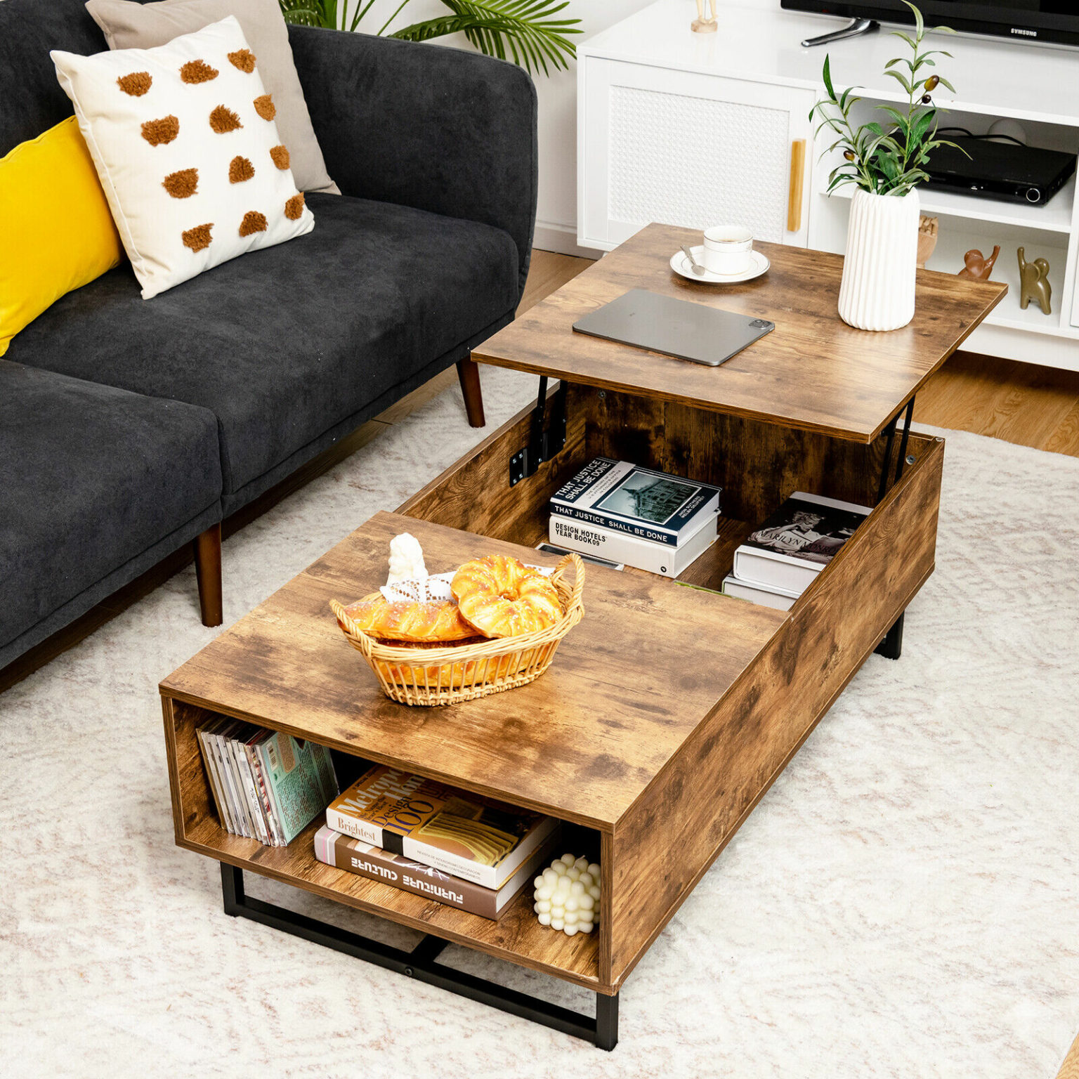 This coffee table has two spacious storage areas, including a concealed drawer beneath the tabletop and an open shelf on the table's side. Depending on your preferences, you can store everyday necessities in the exposed shelf for quick access or the hidden compartment to keep dust out.